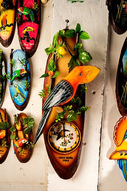 Los ojos blancos de esta artesanía están elaborados con soga cabulla, mientras que los puntos negros son semillas de ojo de vaca. El pico del búho está formado por la semilla shapaca, y las ramas provienen de un árbol frutal conocido como guayaba, decoradas con hojas artificiales. La parte blanca donde se encuentra el reloj está adornada con plumas naturales. Sus dimensiones son aproximadamente de 70 a 80 cm de altura por 20 a 25 cm de ancho, aunque pueden variar ligeramente debido al grosor de la madera bolaina, que se corta con motosierra.